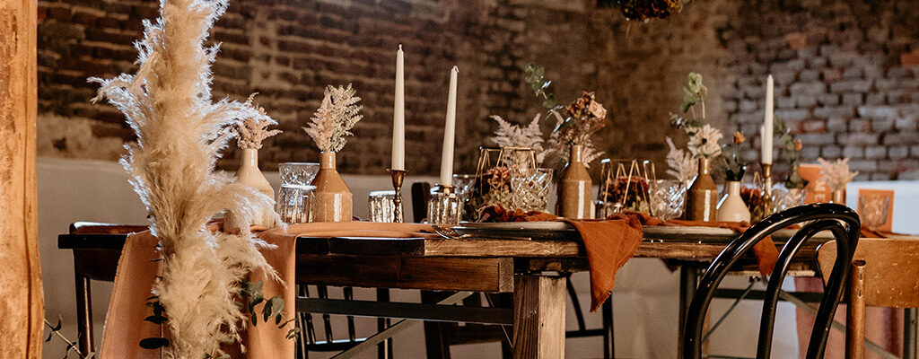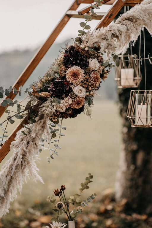 Auch der nächste Trend ist nicht vom Podest zu kriegen – Trockenblumen. Pampasgras mit Eukalyptus ist einfach die Kombination dieses Jahr. Der Vorteil von Trockenblumen ist, dass man sie einfach nach der Hochzeitsfeier weiter als Dekoration verwenden kann und man somit keine Blumen wegschmeißen muss. Der Gedanke der Nachhaltigkeit bleibt auch hier nicht aus.