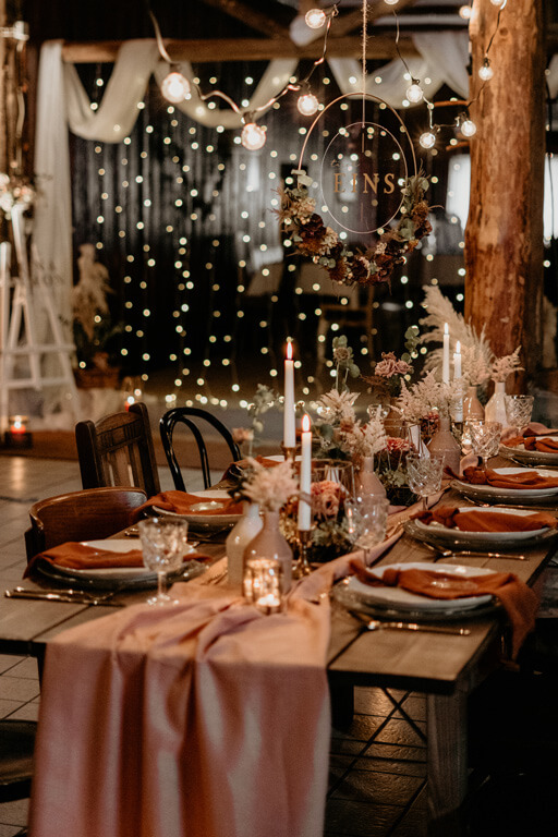 Es geht nun romantisch weiter. Eure Feier ist das absolute Highlight, wenn ihr abends mit einem Lichtertunnel unter dem freien Himmel eure Gäste zum Staunen bringt. Dafür werden Lichterketten so gelegt, dass sie einen Tunnel darstellen. Innerhalb des Tunnels könnt ihr entweder das Buffet ausrichten, die Tische platzieren oder die Tanzfläche eröffnen. Aber auch im Innenbereich einer Scheune wird sehr häufig mit verschiedenen Lichterketten gearbeitet.